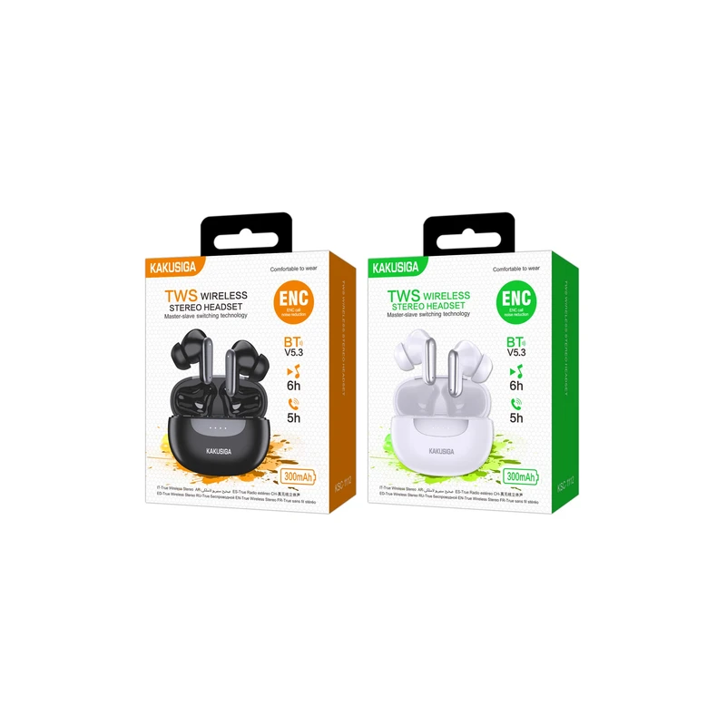 ایرپاد برند kakusiga مدل ksc-1112 تراشه: JL6973D8 ظرفیت باتری: محفظه شارژ: mAh300 ;هدفون 30 میلی آمپری زمان پخش: 6 ساعت; زمان آماده به کار: تقریباً 180 ساعت کاهش نویز پشتیبانی از تعویض slave-master و احضارsiri