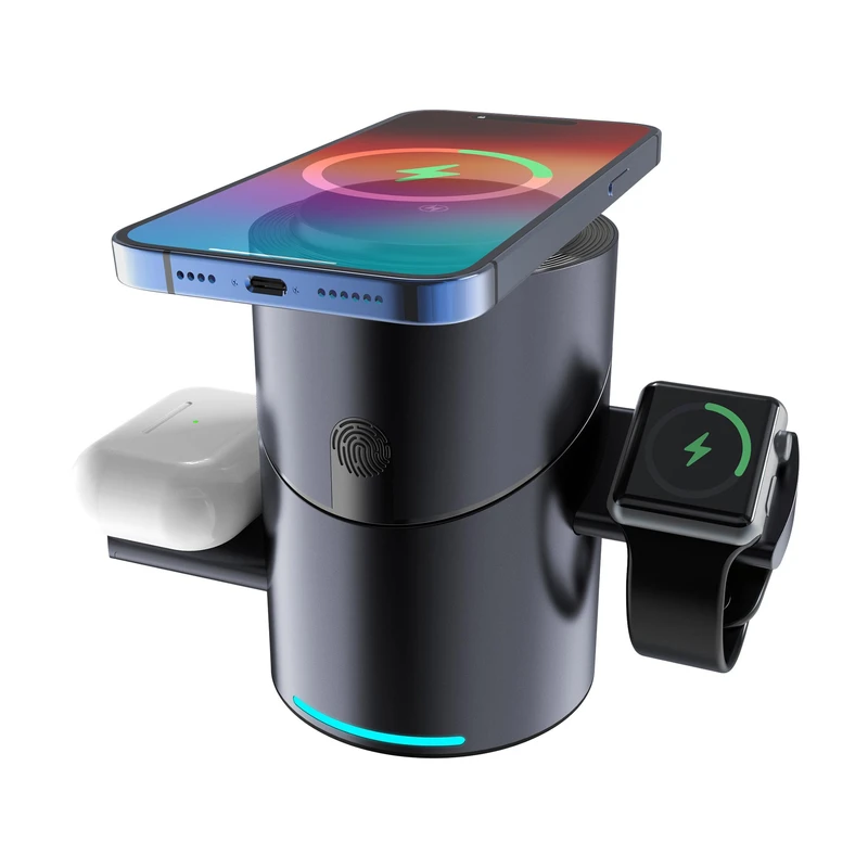 دارای آهنربای داخلی N52 فوق‌العاده قوی برای نگهداری ایمن گوشی، قابلیت شناسایی خودکار دستگاه، و شارژ هم‌زمان سه دستگاه.