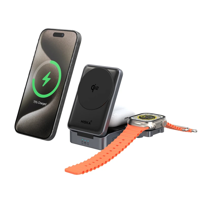گوشی، اپل واچ، ایرپاد هر سه کنار هم، بدون سیم، بدون شلوغی. شارژر وایرلس سه کاره رومیزی هیسکا مدل HR-15 یه ایستگاه شارژ شیکه که میزت رو مرتب نگه میداره و دستگاههات رو همیشه آماده.